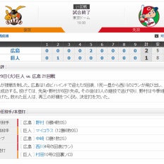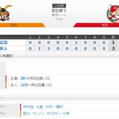 【 巨人試合結果!】< 巨 3-1 広 >巨人連勝!長野先制弾!亀井貴重な適時打!田口好投・巨人逃げ切り貯金「1」