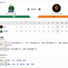 【巨人試合結果!】<巨9-4ヤ> 巨人勝利!先発・桜井8回途中4失点で2勝目!亀井・坂本・岡本・吉川がHR!