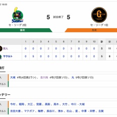 【巨人試合結果】<巨5-5ヤ> 引き分け…先発・今村が2回に5失点も大城・吉川・丸のHRなどで同点に追いつく!