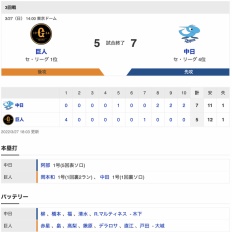 【巨人試合結果…】<巨 5-7 中> 巨人逆転負け…先発・赤星 6回5安打1失点、岡本&中田が共に第1号、坂本4安打