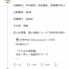 巨人さん、外崎修汰・中村奨吾・田村龍弘・西勇輝をFAで獲得し筒香と田中将大も獲得へ!?