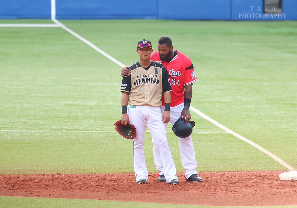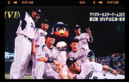 ナゴヤドームの一塁側ではセ・リーグ全員の集合写真撮影の後、各球団ごとの撮影に。ヤクルト小川選手はただ1人の出場でウロウロしていると、巨人マギー選手が声をかけて肩を抱いていました。