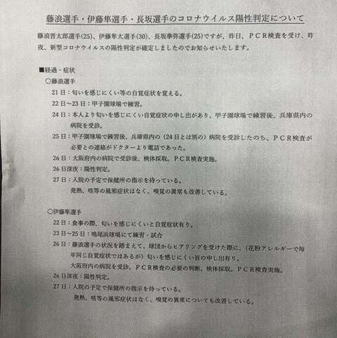 阪神は長坂拳弥捕手(25)が前日18日に体調不良を訴え、