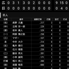 長野久義 .182 1本 2打点 OPS.497 得点圏.000(20-0) 走者あり.102(39-4) 5併殺