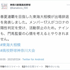 【悲報】センバツ王者の東海大相模、部員17人がコロナ陽性で出場辞退…